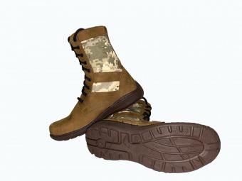 Берци коричневі шкіряні, полегшені на поліуретановій підошві. Клеєво прошивний метод кріплення, в голіностопній частині встановлена міцна тканина піксельного забарвлення.