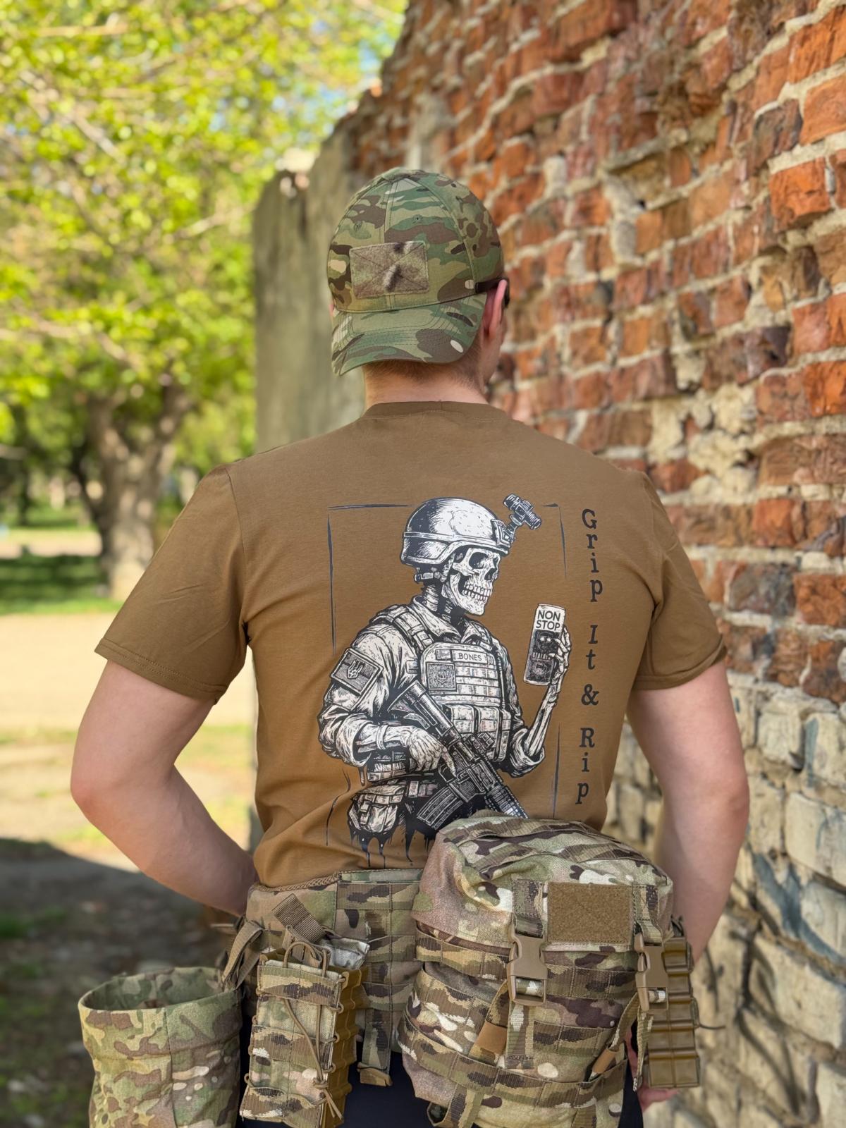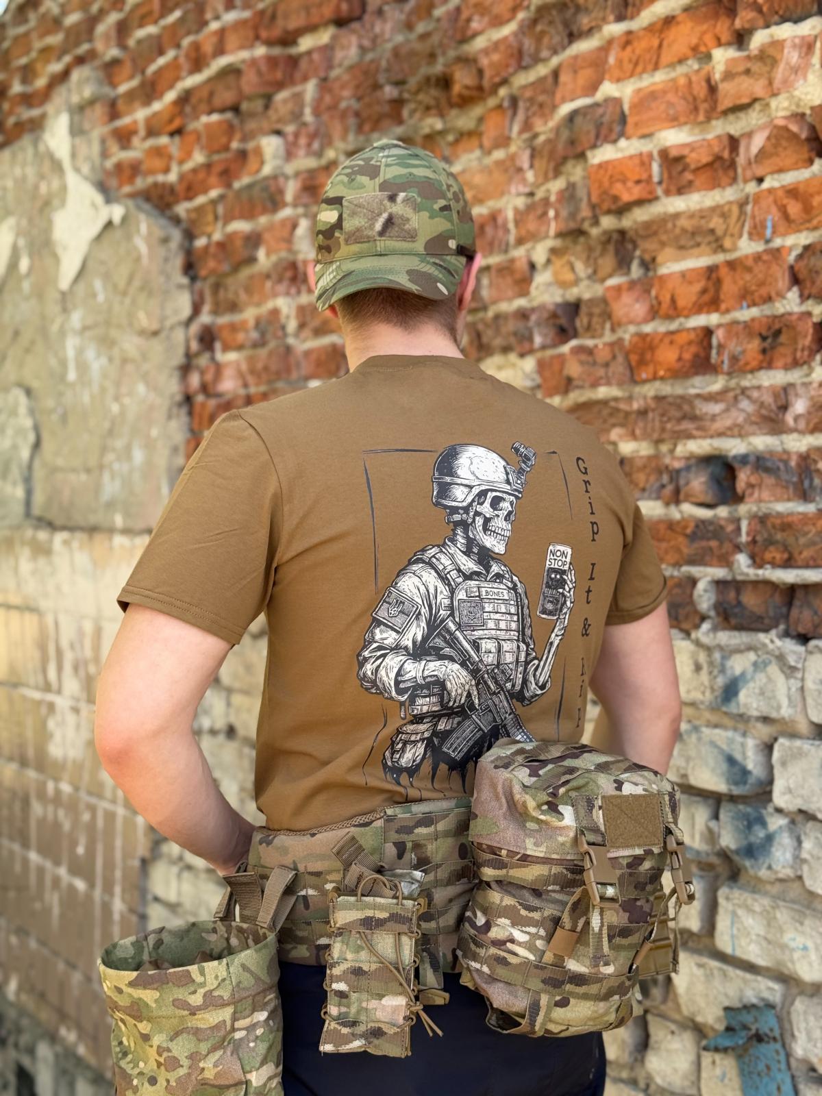 Футболка “Grip” — для тих, хто звик тримати удар і йти до кінця. Унікальний принт з деталізацією бойового спорядження, енергетика NON STOP і дух незламності — ідеальний вибір для військових, фанатів тактики та тих, хто не приймає компромісів.