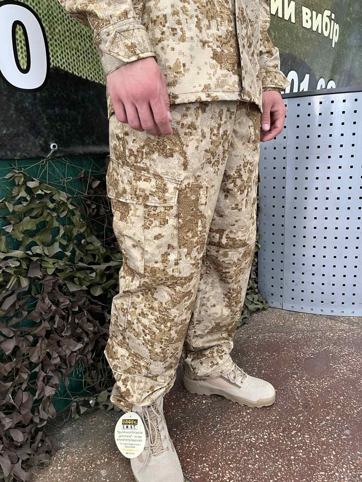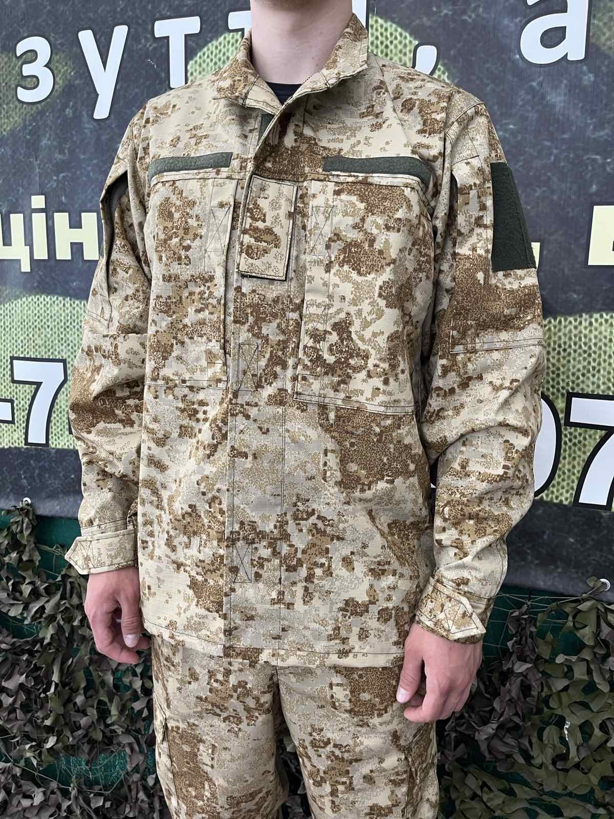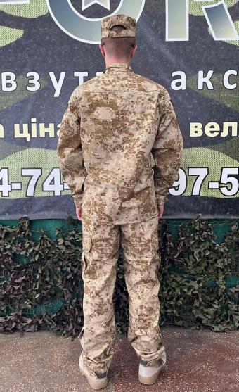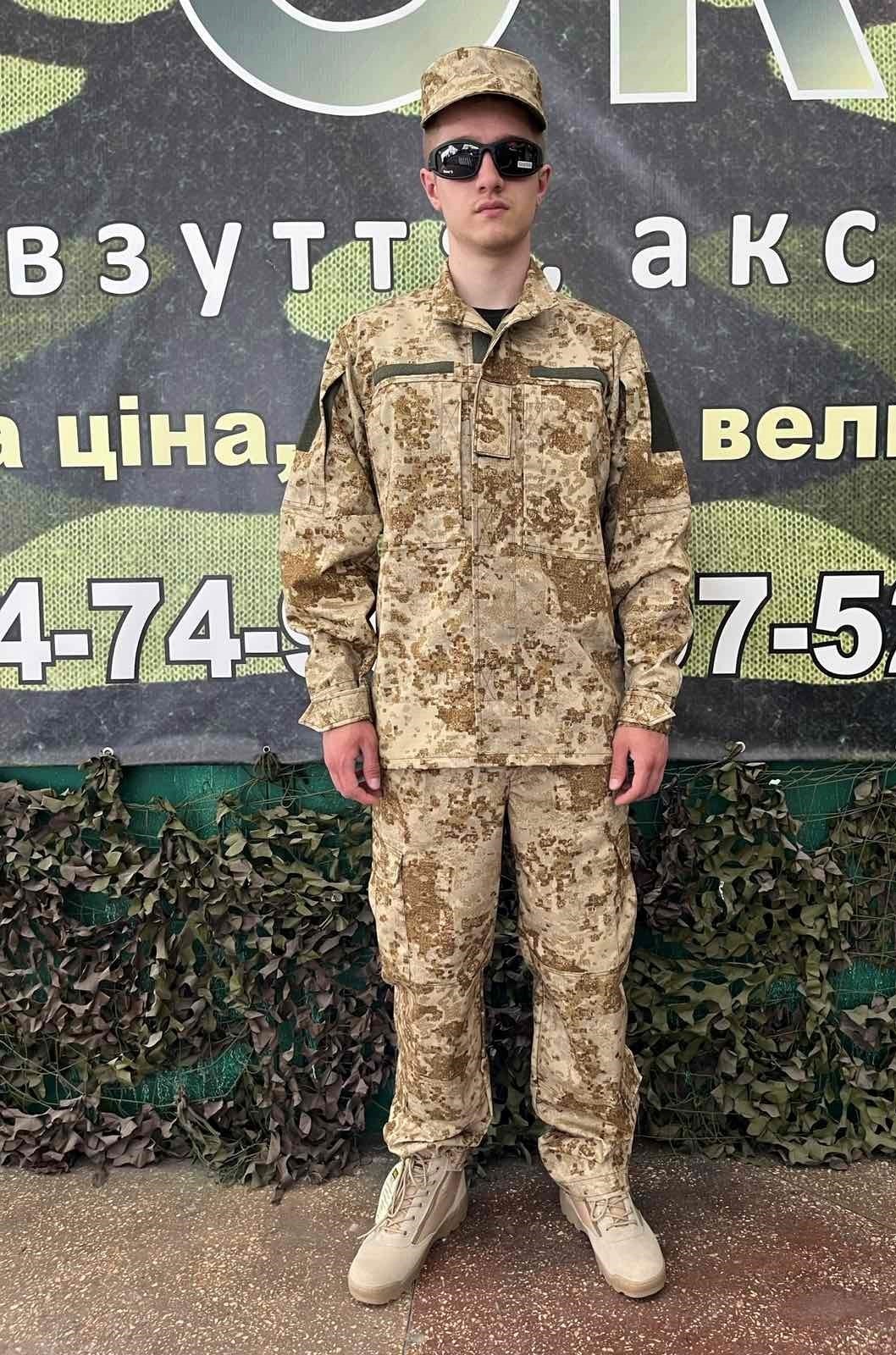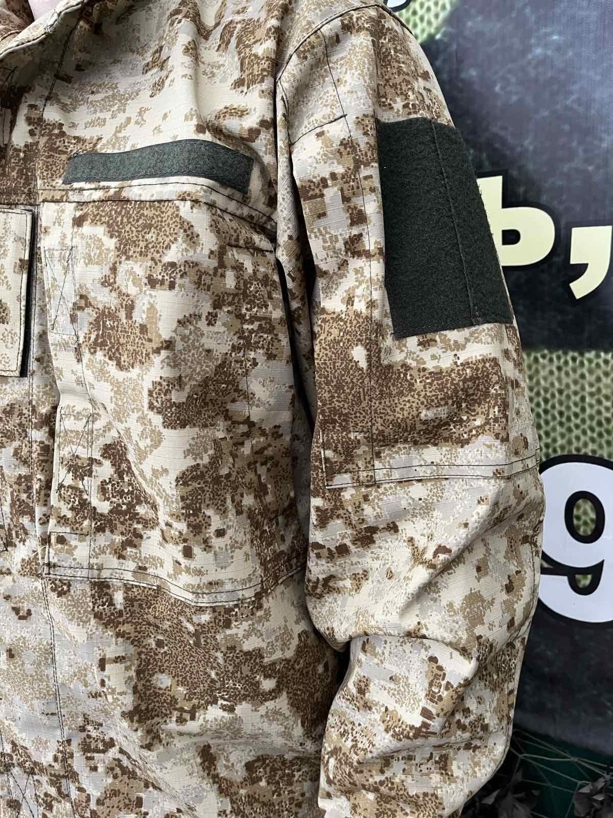 Виконано костюм з міцного і разривостійкого матеріалу RipStop. Тканини RipStop (РіпCтоп) - розроблені спеціально для важких умов експлуатації при максимальному навантаженні. Основною особливістю тканини є, вбудовані в структуру, армовані нитки через кожні 5-8 мм тканини, що утворюють так званий "каркас" (посилення), який значно підвищує характеристики міцності, без збільшення ваги матеріала. Крім того, обмундирування з тканини Ріп-стоп захист зберігає свій зовнішній вигляд протягом усього терміну експлуатації виробу.