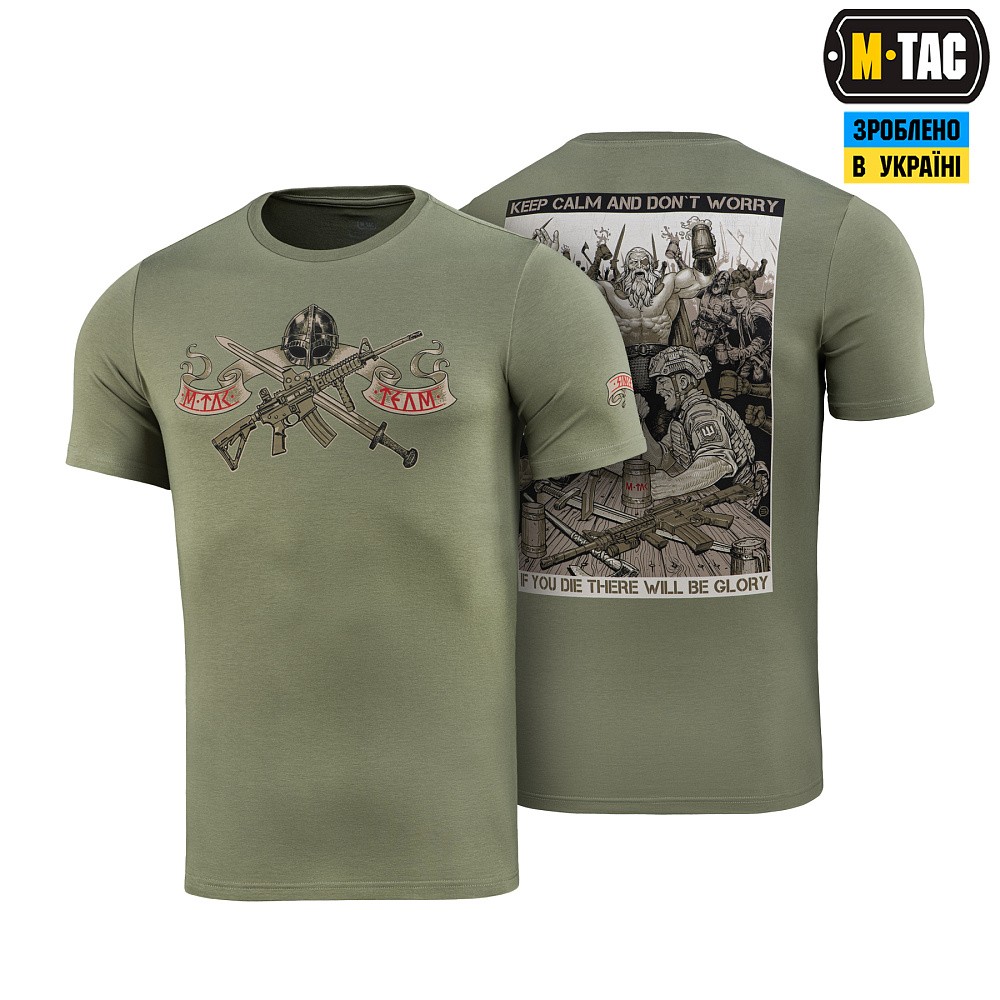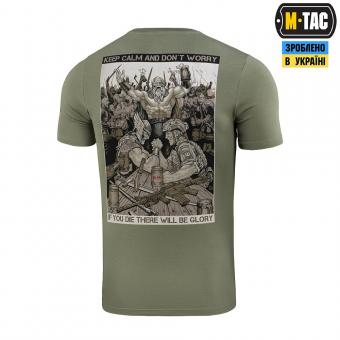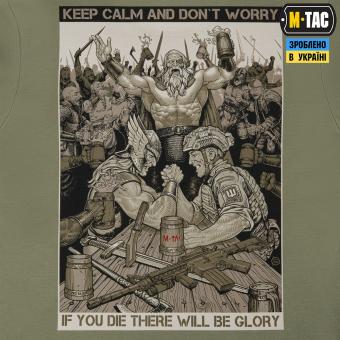 На принті футболки зображено сюжет, на якому український захисник потрапляє в Валгаллу. Там з одним із стародавніх воїнів, він зійшовся в дуелі з армреслінгу, а час до початку поєдинку для них відраховує сам Одін. Написи на принті “KEEP CALM AND DON'T WORRY” та “IF YOU DIE THERE WILL BE GLORY” символізують славу для кожного захисника рідної землі, навіть після смерті.