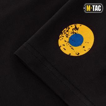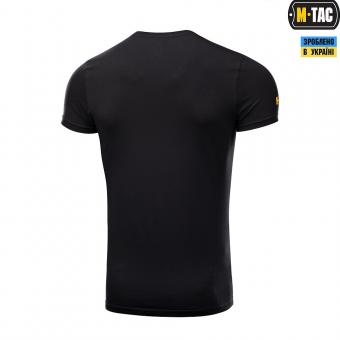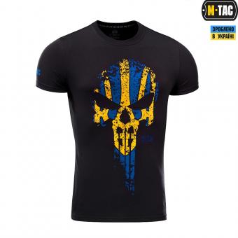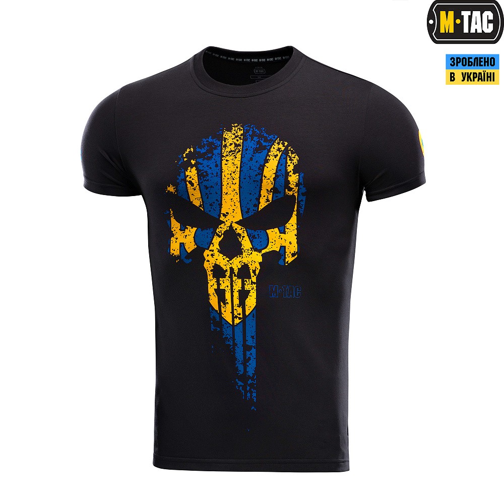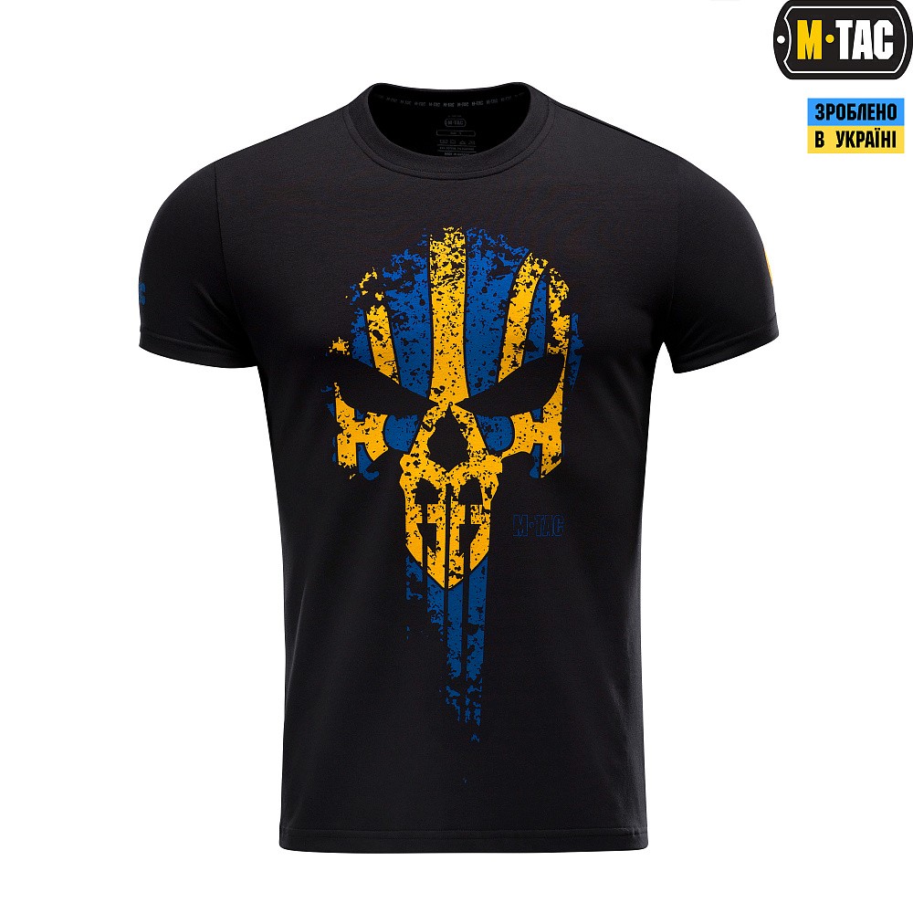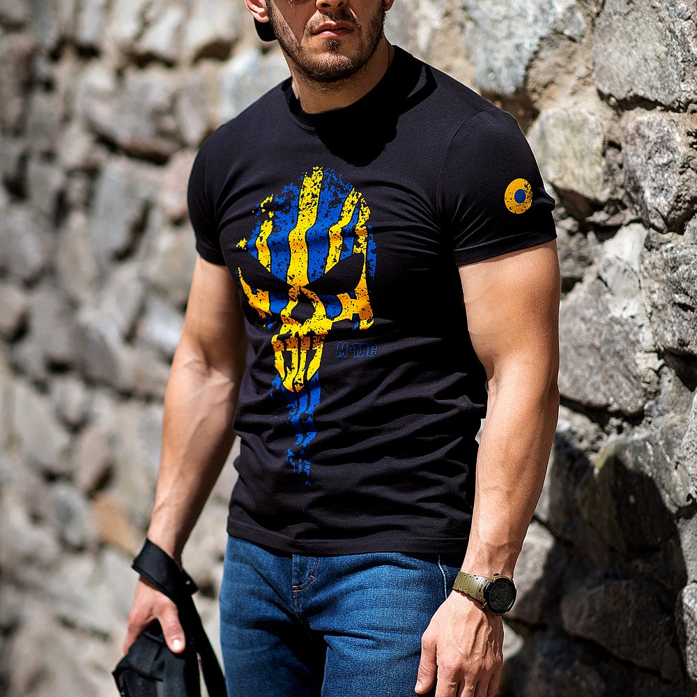 На передній частині футболки - стилізований череп «Punisher» синього кольору, на якому чітко проглядається зображення державного герба України - Тризуба, виконаного жовтим кольором. І непомітний логотип M-TAC (Синім). Таким чином забарвлення принта викликає асоціації із державним українським прапором.