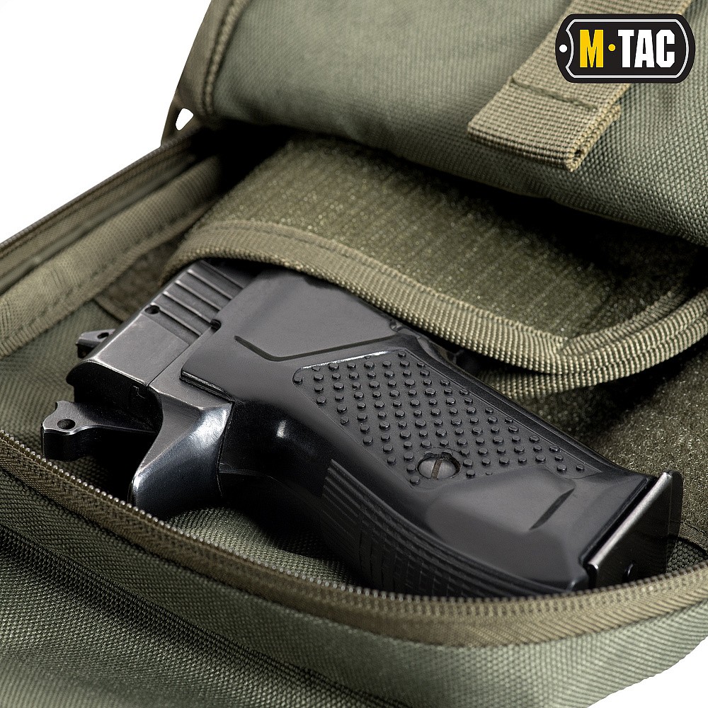 M-Tac сумка-кобура наплічна розроблена для прихованого носіння Вашого пістолета. Усередині сумки встановлена універсальна кобура на липучці (що дозволить Вам підлаштувати під більшість моделей пістолетів). За допомогою спеціальних хлястиків Ви зможете оперативно відкрити сумку і витягти з неї зброю. Пояс має зручне регулювання за обсягом. Для зручності в сумці є п'ять додаткових відділень для розміщення особистих речей, що дозволить розвантажити кишені брюк, сорочки куртки або шорт. Дана сумка сумісна практично з усіма видами пістолетів, включаючи модельний ряд пістолетів ФОРТ, ПМ і модифікації, Glock, Кольт і багато інших.