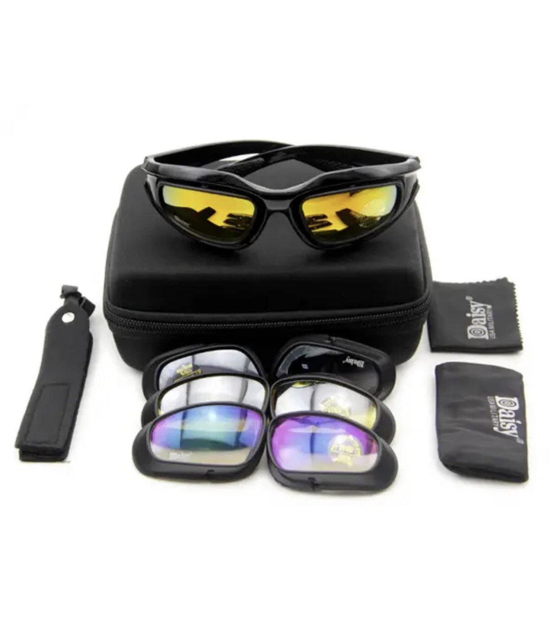 Захисні тактичні окуляри з поляризацією Daisy C5 + 4 комплекти лінз  Легкі та міцні окуляри, що забезпечують надійний захист ваших очей.  Окуляри мають 4 змінних комплекти фільтри, які допомагають покращити якість та чіткість зображення у різний час доби. Також змінні лінзи мають покритті для захисту від запотівання та подряпин.  Кольорові лінзи дозволяють використовувати окуляри при якому денному освітленні. Поляризаційні лінзи зменшують відблиски та відображення, що підвищує чіткість зображення. Прозорі лінзи дозволяють використовувати окуляри за будь-яких погодних умов і в будь-яку пору року. Жовті лінзи дозволяють покращити контрастність і видимість в умовах слабкого освітлення або використовуються при керуванні на техніці або автомобілі.