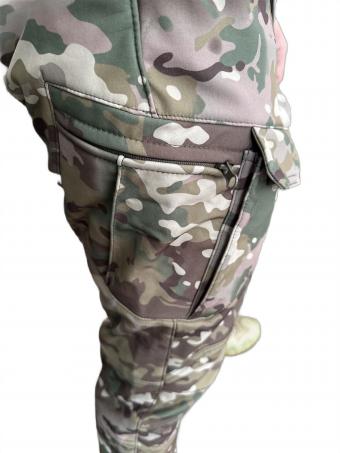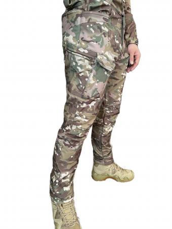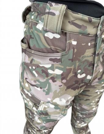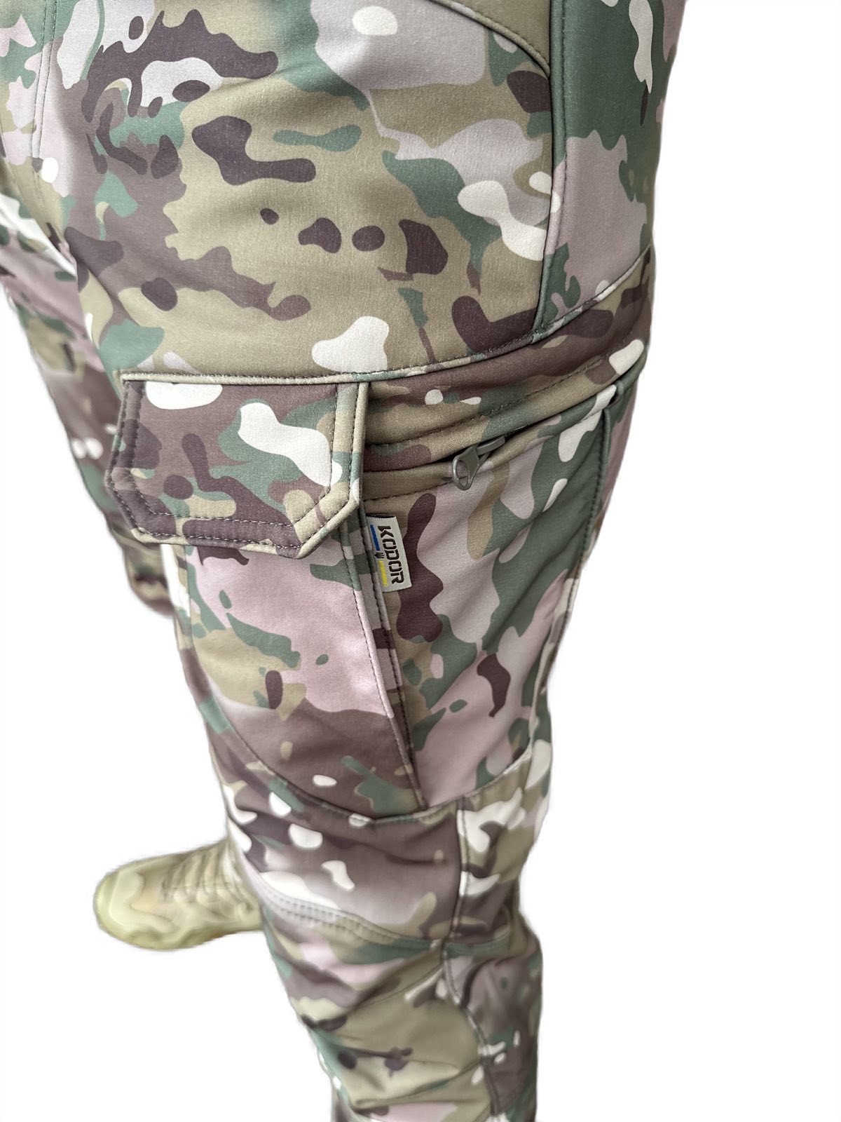 Штані вироблені з оригінальної тканини SoftShell. Це легка, сучасна тканина зі справжньою безпоровою мембраною, яка складається з трьох шарів: мікрофліс який зберігає тепло; мембрана що захищає від вітру та вологи; еластичний поліестер із вологостійким просоченням, який захищає від пилу, бруду й вологи.