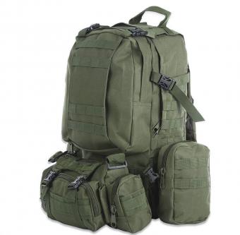 Підсумки кріпляться системою MOLLE, і легко знімаються. В комплекті рюкзак та три підсумки: два бокових і один центральний.